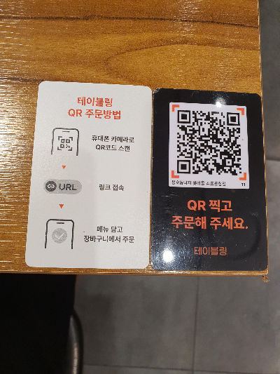 자리에 앉아서 주문을 하려고 했는데요. 독특하게 핸드폰으로 주문을 하게 되어 있었습니다. 저보다 젊은 아내 분이 더 잘할 것 같아서 아내 분이 핸드폰을 꺼내어 테이블링 QR로 주문을 하였습니다.