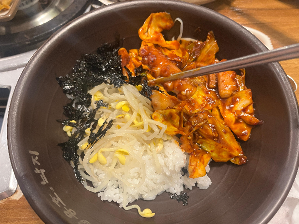밥대접에 콩나물과 김가루를 낙지와 함께 넣어주고 덮밥처럼 먹어보았습니다.