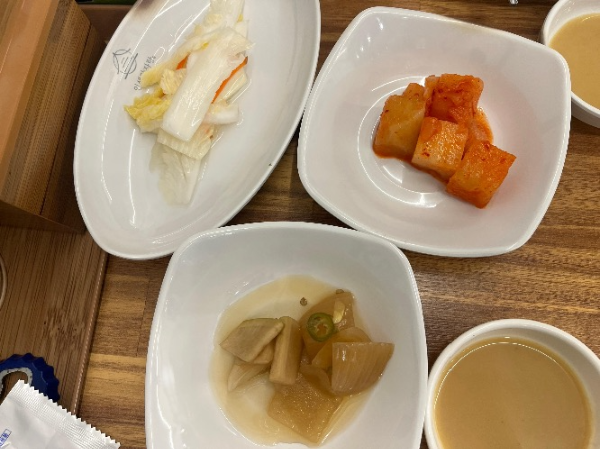 먼저 밑반찬이 나왔습니다. 백김치와 깍두기입니다. 맴찔이에게는 정말 맛있는 백김치입니다. 뼈해장국이 매운 음식은 아니지만 맵찔이에게는 간혹 매운 것도 있어서 김치랑 먹기에는 조금 부담스럽기도 했는데 정말 반가운 백김치였습니다.
