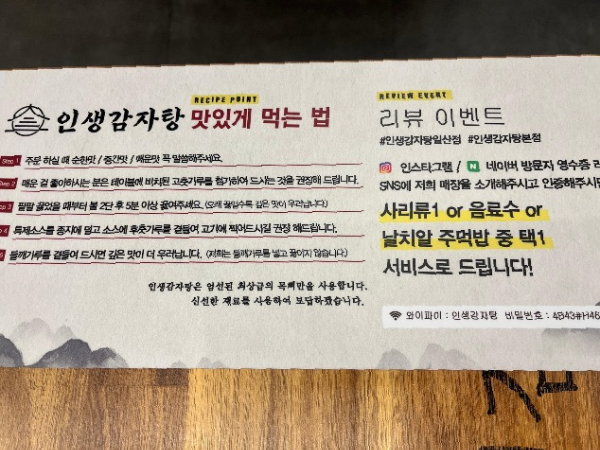 지나던 길에 우연히 찾아간 인생감자탕집인데요. 특별한 맛집은 아니지만 새로운 감자탕 메뉴도 있고 본인 입맛에 맞게 선택의 폭이 이 넓은 감자탕은 굉장히 좋은 점이었던 것 같습니다. 묵은지 감자탕이나 파김치 감자탕처럼 새로운 감자탕을 먹어봐야 인생감자탕의 진짜 맛을 알게 될 것 같습니다. 다음번에 방문하게 된다면 도전해봐야겠습니다. 잘 먹었습니다.