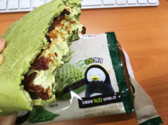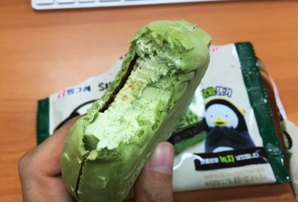 머리부터 먹었습니다. 녹차 아이스크림으로 꽉 차있습니다. 겉면의 빵도 녹차맛이 강하고 안에 아이스크림도 녹차맛이 강해서 맛이 쌉싸름합니다.