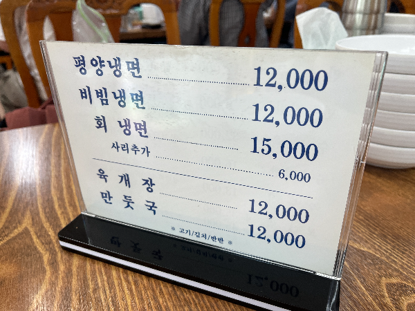 메뉴판입니다. 냉면은 평양냉면, 비빔냉면, 회 냉면 세가지가 있는데요. 평양냉면과 비빔냉면은 1만2천원으로 꽤나 괜찮은 가격이었습니다. 요즘 평양냉면 가격이 많이 올라서 거의 2만원에 육박하는 것으로 알고 있었는데 이곳 평장원은 12,000원으로 그나마 괜찮은 가격이었습니다.