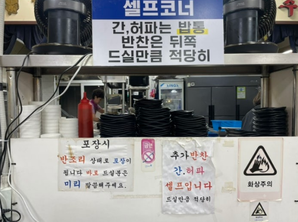 마지막으로 이곳의 하이라이트자 별미인 간과 허파인데요. 셀프코너에 가면 따뜻한 간과 허파를 무료로 마음껏 먹을 수 있었습니다. 따뜻하게 먹는 허파와 간이 맛있어서 많이 먹고 싶었지만 국밥에 있는 고기들과 순대의 양만으로도 배가 불러 아쉽게 많이 먹지는 못했습니다. 그리고 이곳에서 먹는 특이한 점인 초장에 찍어 먹는 것이었는데요. 순대와 같이 소금을 찍어먹던 간과 허파를 초장에 먹으니 나름 별미처럼 맛있었습니다.