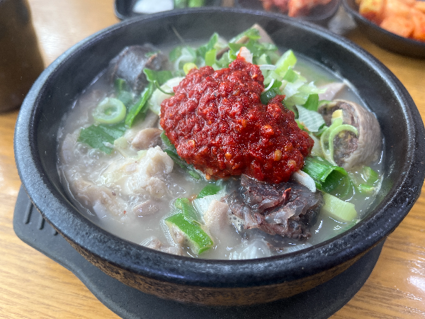 주문한지 얼마 안되어서 주문한 모듬국밥이 바로 나왔습니다. 빨간 양념장이 가운데 떡하니 올라가 있는 모습인데요. 주문할 때 양념장을 올려줄지 물어보시더라고요. 기호에 따라 양념장을 올려주시는 것 같습니다.