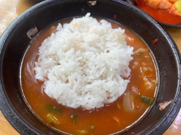 넉넉한 고기와 순대 덕분에 배가 조금씩 차올랐지만 국밥엔 역시 밥을 말아먹어야 합니다. 빨간 양념장이 매울 줄 알았는데 매운맛은 거의 없어서 맴찔이는 맛있게 먹을 수 있었습니다. 국밥에 콩나물이 들어있어서 잠깐 이상하게 생각했지만 모듬국밥이니까 모두 넣었나보다 했습니다.