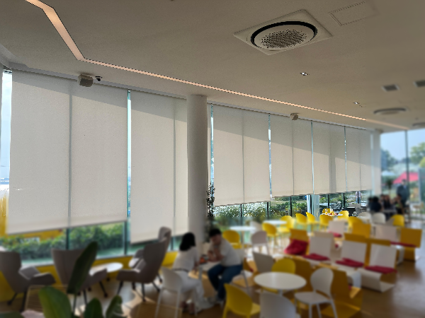 먼저 음료부터 주문하기 위해 카페 건물로 들어왔습니다. 해가 지는 서해 바닷가 쪽으로 통창으로 확 트여 있었는데요. 아직은 햇빛이 강해서 블라인드를 내려놓은 모습입니다.