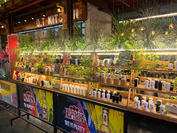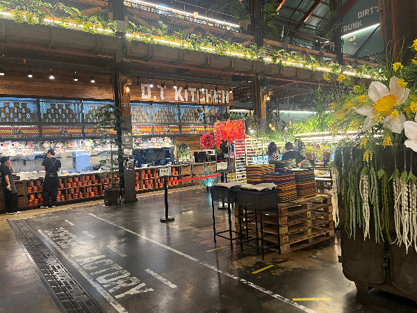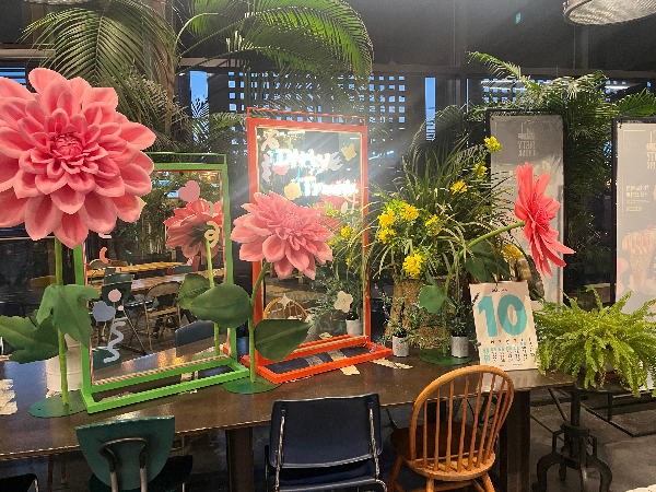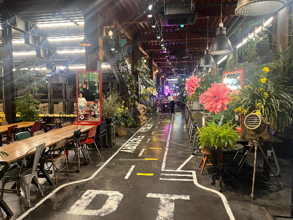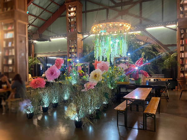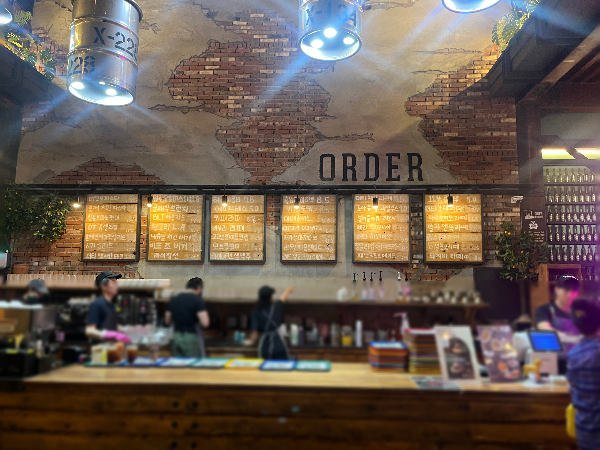 창고형 대형카페로 전체적으로 어두운 바탕이라서 밝은 조명과 알록달록한 꽃의 색감이 눈에 확 들어오는 것 같았습니다.