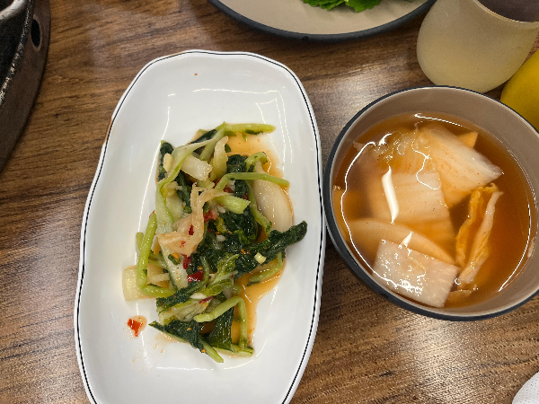 밑반찬으로는 김치와 김치국물이고 쌈이 있습니다.