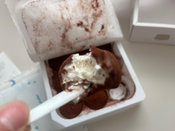 한입에 쏙 먹기 좋은 크기였지만 속 안을 살펴보기 위해 한입 베어 먹어보았습니다. 찰떡아이스 느낌과 비슷하기도 했지만 부드러운 우유향과 쫀득한 느낌도 살아있고 겉을 감싼 초콜릿은 너무 묵직하지 않은 느낌에 굉장히 조화로운 맛이었습니다.