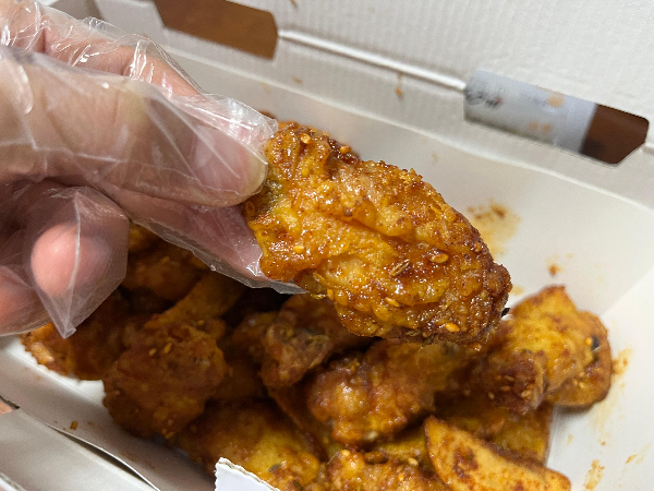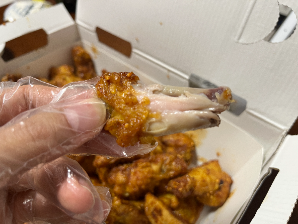 이제 60계치킨의 쯔란콤보를 먹어보겠습니다. 쯔란콤보에서 날개와 윙봉 중에 윙봉을 먼저 집었습니다.