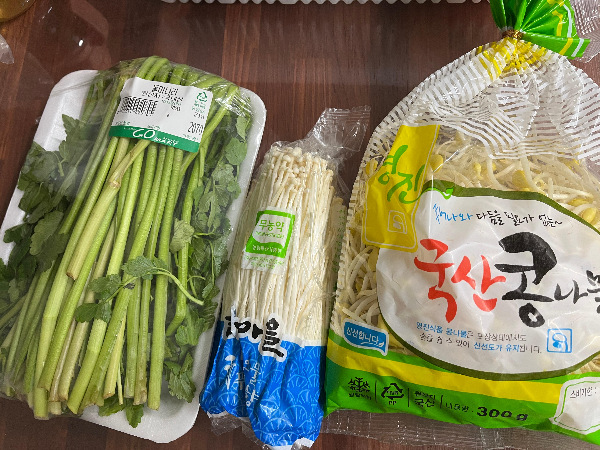 국산 왕대구탕을 조리하기 전에 채소를 더 추가하고 싶어서 미나리와 팽이버섯 그리고 시원한 콩나물을 따로 준비해보았습니다.