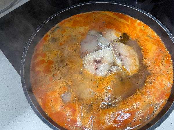 물이 끓으면 대구를 넣고 7분간 끓인 후에