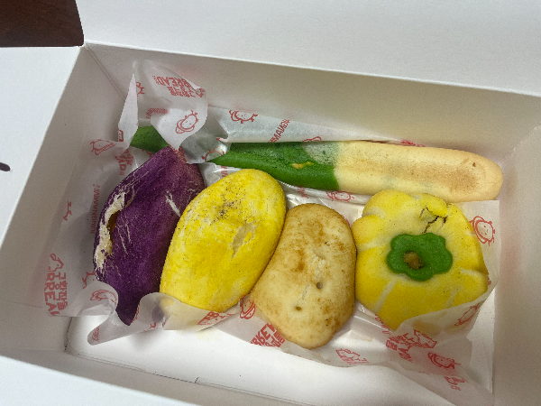 구황작물빵으로 5가지가 들어있었습니다. 유명한 감자빵부터 자색고구마빵, 옥수수빵, 단호박빵, 파빵까지 생김새가 정말 똑같고 귀여웠습니다.