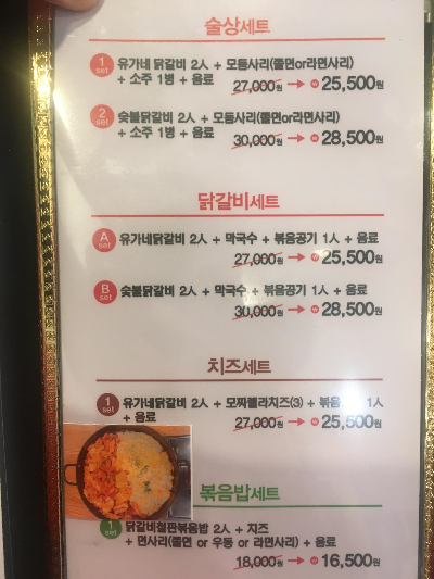 저희는 닭갈비세트 Aset (유가네닭갈비 2인+막국수(물막국수)+볶음공기 1인+음료=25,500원) 주문했습니다.