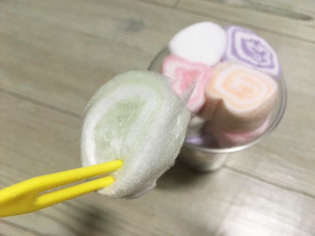 솜사탕입니다. 알록달록하게 돌돌 말린 솜사탕입니다. 손이 끈적이지 않게 센스 있게 포크까지 넣어주셨습니다.