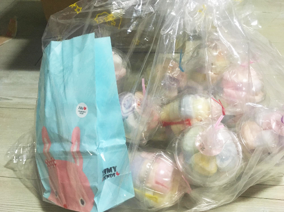 알록달록한 솜사탕 10개와 푸릇푸릇한 종이봉투입니다.