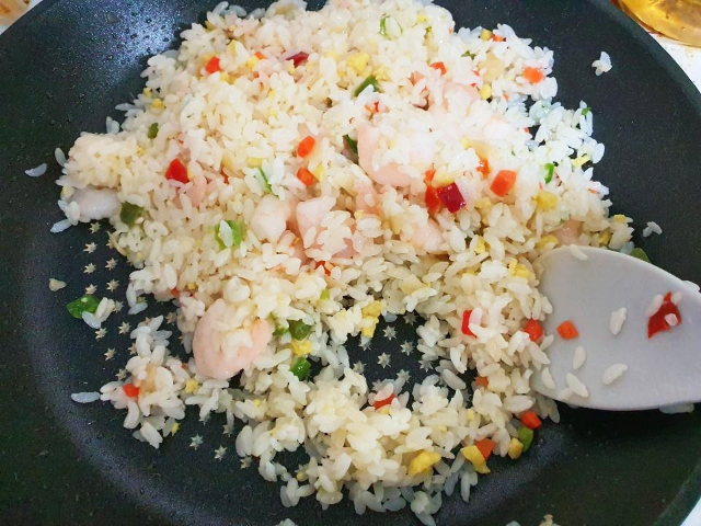 조리방법은 간단합니다. 프라이팬 조리 시 기름을 살짝 두른 후 중불에서 5분 정도 골고루 저어가며 볶아줍니다. 밥이 물렁하게 익어가고 새우가 탱글탱글해지면 됩니다.