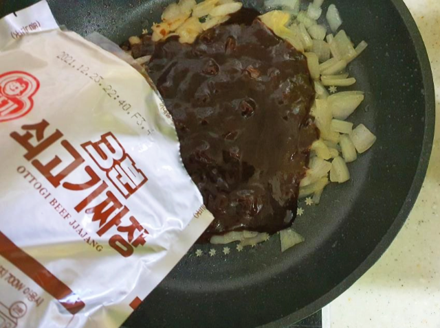 양파가 익었다 싶으면 3분 쇠고기짜장을 부어줍니다. 소스가 양파와 잘 섞이도록 3분 정도 저어주면 됩니다.