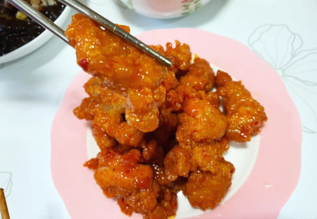 정통 깐풍기는 튀김 옷도 안 벗겨지고 바삭하게 잘 튀겨졌습니다. 닭고기도 다리살이라서 그런지 퍽퍽함이 전혀 없고 쫄깃쫄깃했습니다. 소스는 냄새 맡았을 때 짠내가 심했는데 먹어보니 살짝 짠맛이 있지만 냄새처럼 심하지 않고 살짝 매콤하며 달달한 게 괜찮았습니다.