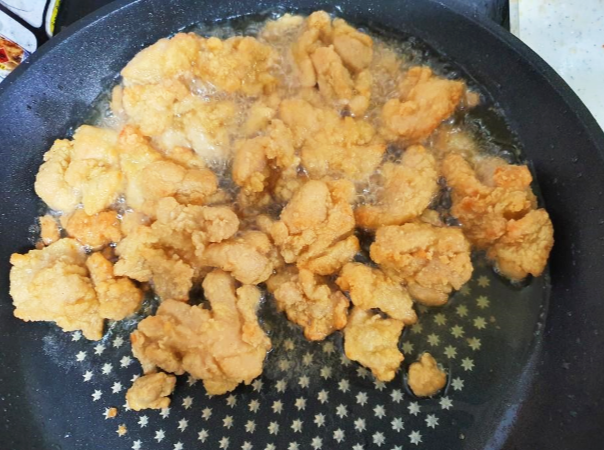 바삭하게 잘 익은 것 같습니다. 깐풍기 소스는 끓는 물에 살짝 데워줍니다.