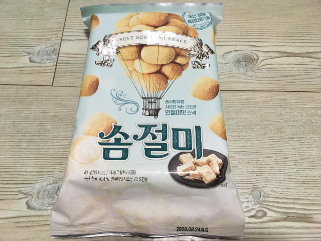 겉봉지의 인절미 그림으로 봐서는 과자라는 느낌이 안 들었습니다. 찰떡아이스크림처럼 쫀득한 떡 안에 아이스크림이 들어있듯이 솜절미도 쫀득한 떡 안에 바삭한 과자를 품고 있는 건지 바삭한 겉면에 쫀득한 떡이 안에 들어있는건지 솜절미 겉봉지의 하늘로 떠오르는 열기구 그림처럼 여러 가지 생각이 떠올랐습니다.